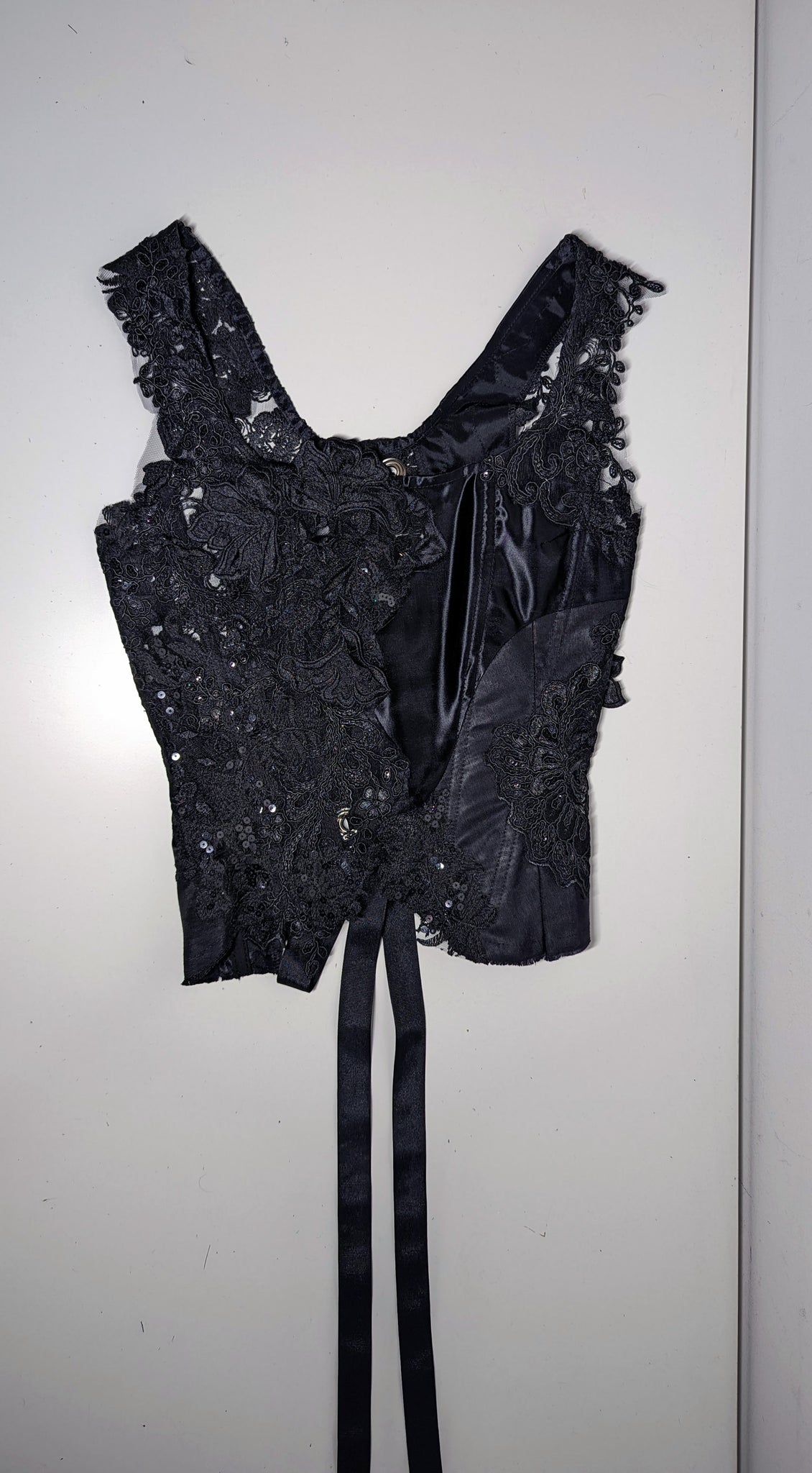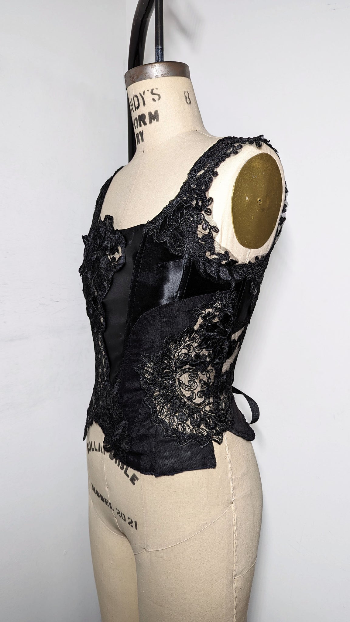 Corset made from vintage black lace, satin and silk voile. Individual embroidered sequins, leaves and flowers have been carefully overlapped around the body creating contour with varying opacities. Features uneven, organic look bottom edge, and is reinforced for stability and strength, while still maintaining a delicate look. Fully boned for structure, with stainless steel grommets at back for lacing. Custom made to order. Please allow 6-8 weeks to receive.