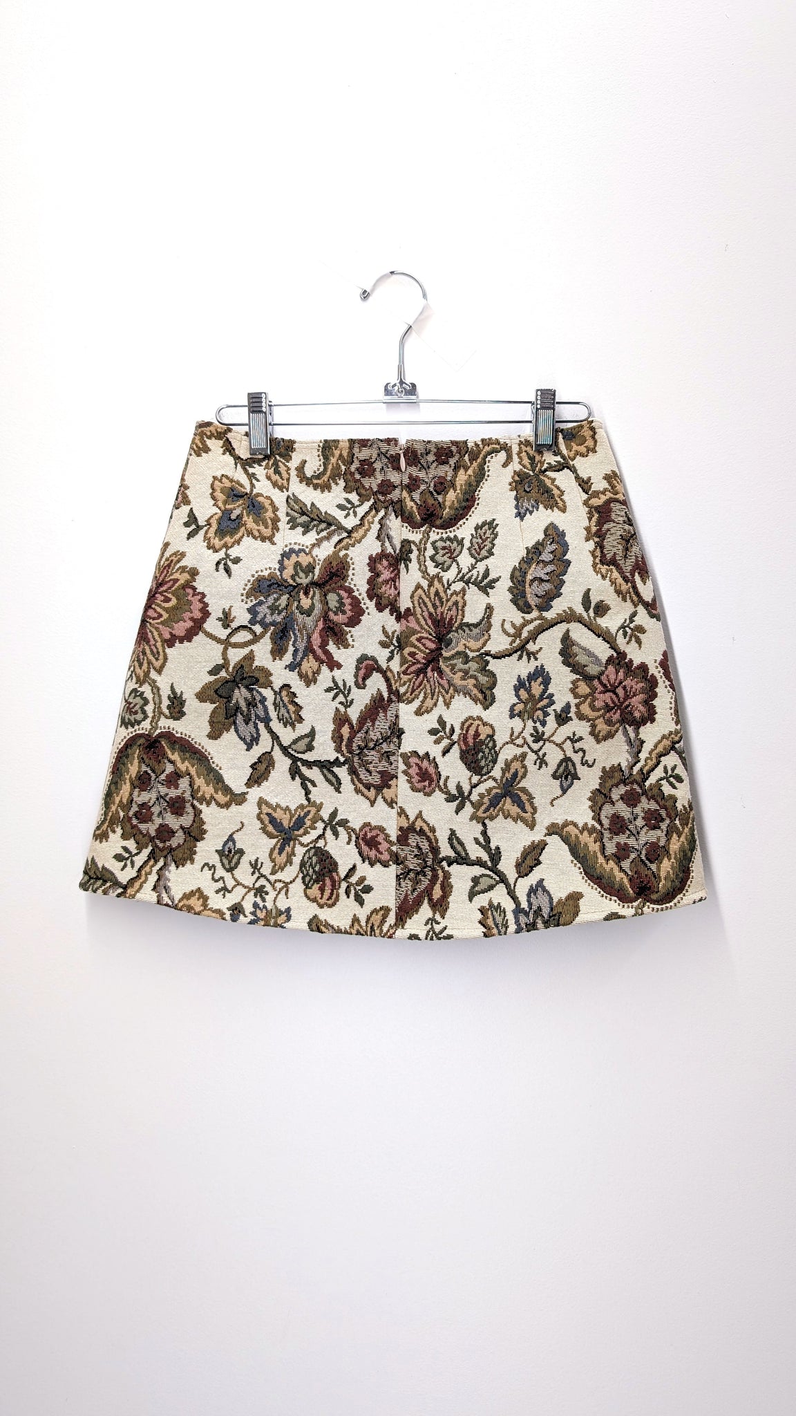 Mini skirt made from a vintage french tapestry featuring four cherubs, surrounded by foliage and sky. Back of skirt made from vintage floral upholstery fabric. Unlined. Invisible zip closure at center back.