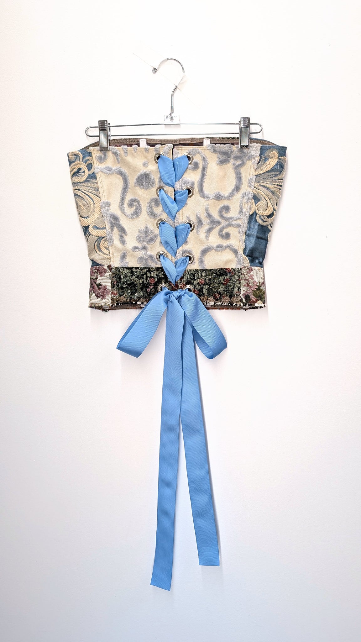 Corset made from a vintage tapestry featuring a landscape scene with a castle and two swans on a lake. Body patchworked with vintage floral upholstery fabrics. Unlined. Fully boned for structure, with stainless steel grommets at center back. 100% Polyester grosgrain ribbon.