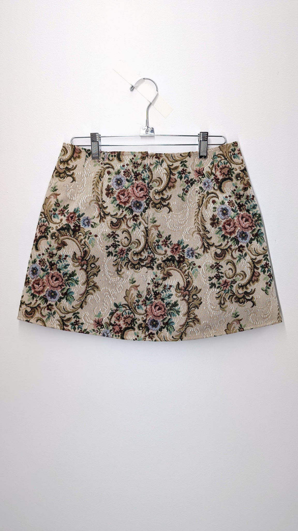 Mini skirt made from a vintage french tapestry featuring an 18th-century scene with three people playing music in a garden. Back of skirt made from mixed vintage upholstery fabrics. Unlined. Invisible zip closure at center back.